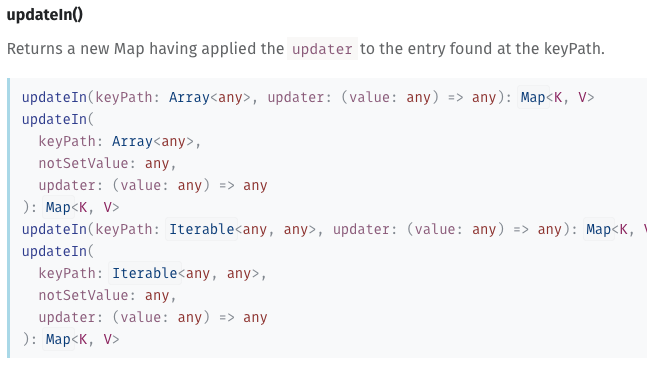 updateIn() is a useful function to use when you’re interacting with Redux. I had to understand it. In the end, what helped me become productive with updateIn() was understanding the keyPath parameter.